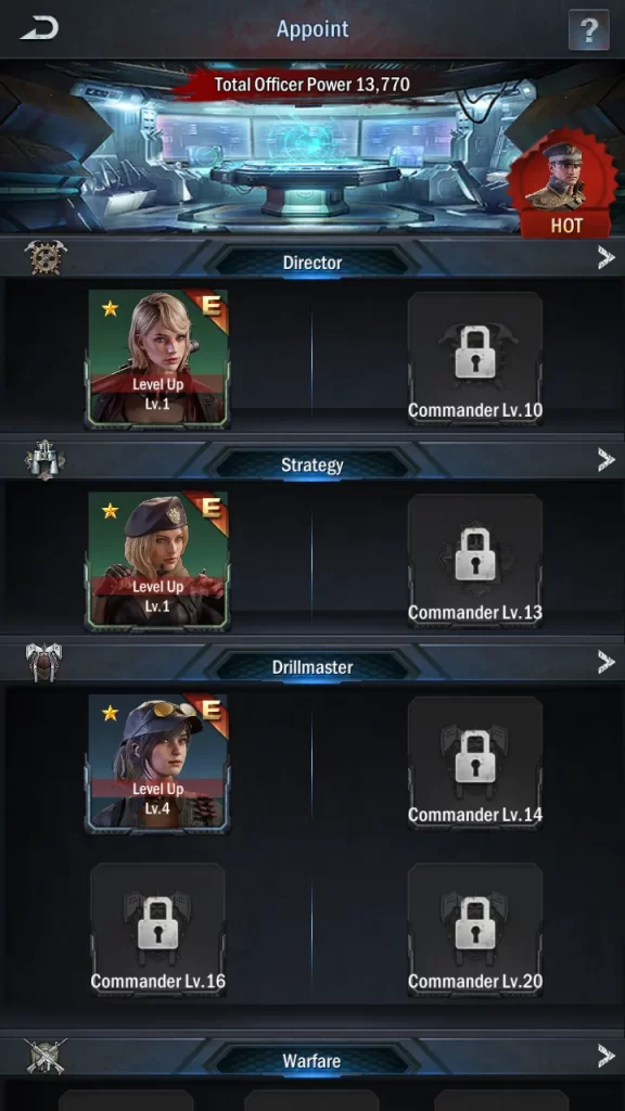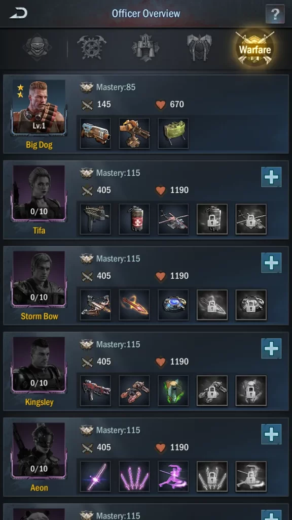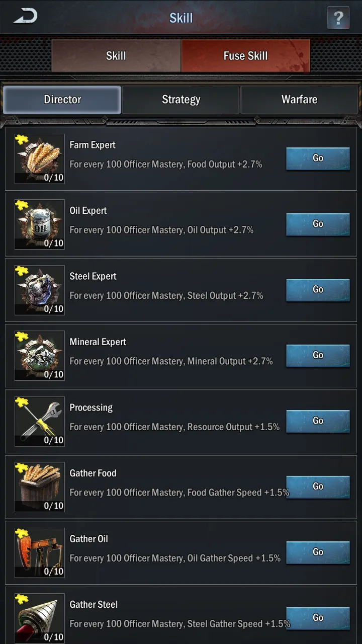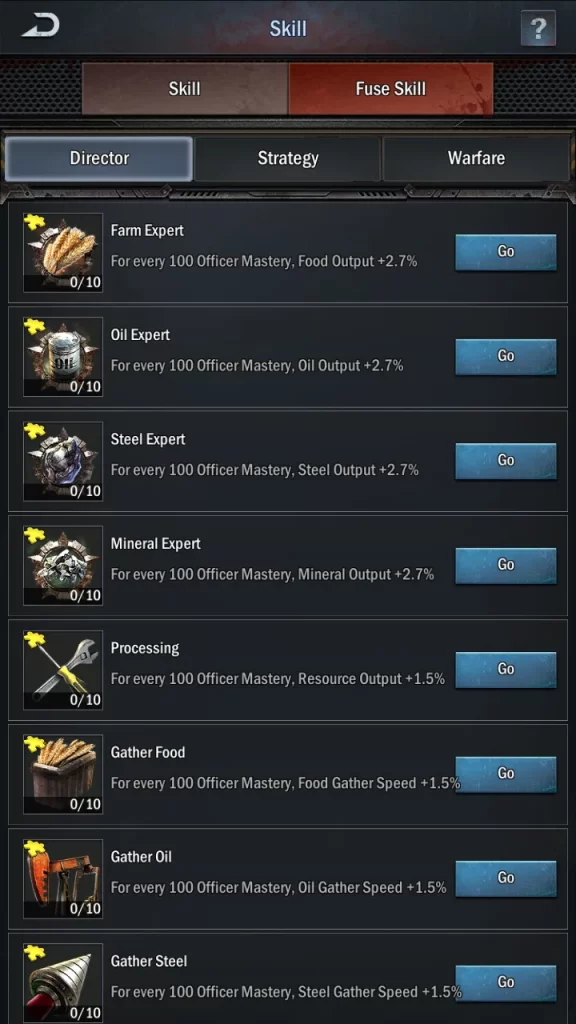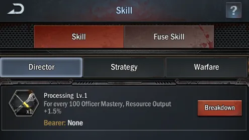 Mastery dictates how effective a skill is. On a skill’s info panel, you’ll be able to see exactly how the game computes bonuses; in most cases, a skill will grant a bonus per 100 Mastery of the officer it’s equipped to. As you level up a skill, you’ll be able to raise its scaling, giving better returns. The long and short of this is to try to have one Director, Strategy, and Warfare hero with a high star rating and level (Mastery) so you can maximize your skills.