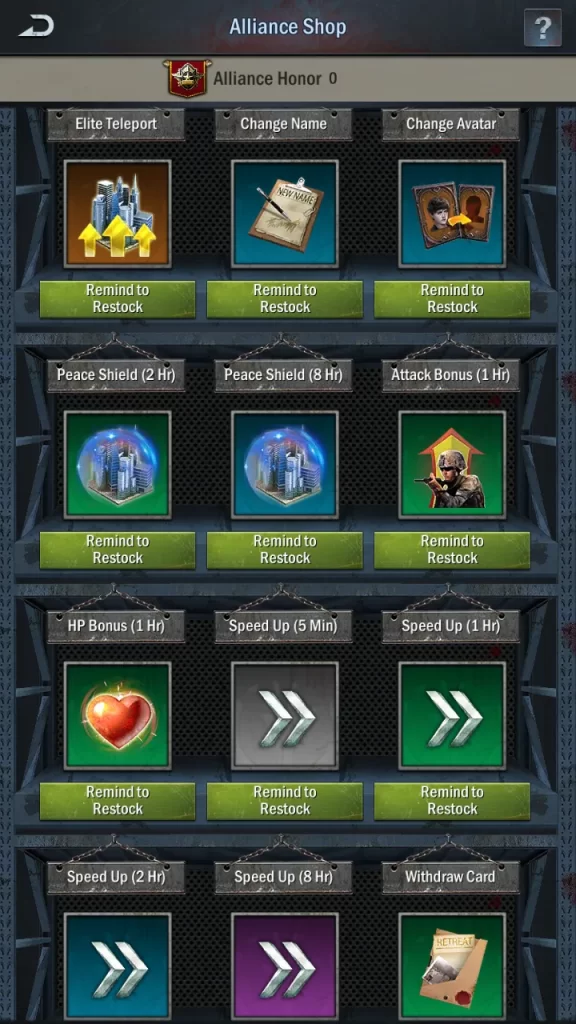 The alliance shop stocks a variety of useful items, such as buffs, speed-ups, teleportation items, and the all-important peace shield. However, it needs to be stocked by senior members, so you might want to ask if the items are being reserved for a particular member or not.