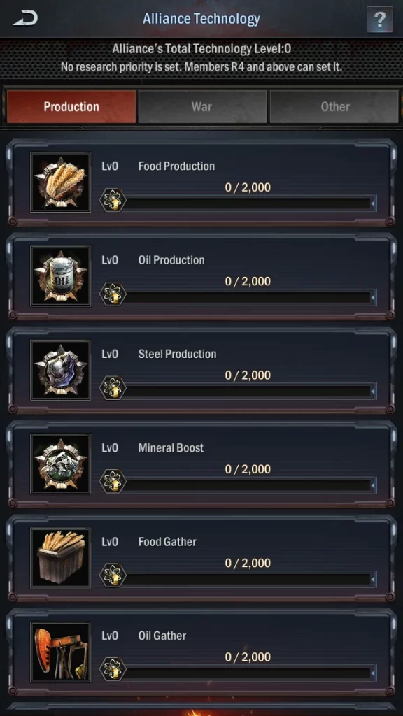 - Alliance members have access to a unique technology tree that works similarly to the one in the Academy. Research here takes a long time and requires resources, so communicate with your senior guild members and alliance mates to find out which project they want people to focus on.
