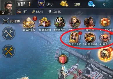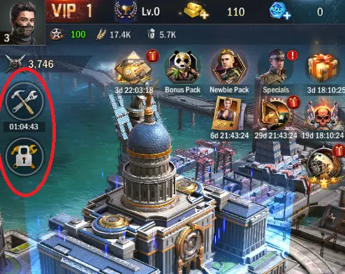 Now, you can get a second builder in several ways. The most straightforward way to unlock your second construction slot is by shelling out real cash on the Eternal Queue pack, which gives you an Eternal Golden Hammer. However, you can also use a regular Golden Hammer to unlock the second builder slot for a limited time. Keep playing through your tutorial quests, and you’ll quickly get a 1-day Golden Hammer – which I urge you to use, as 3 days isn’t a lot of time to get up to speed!