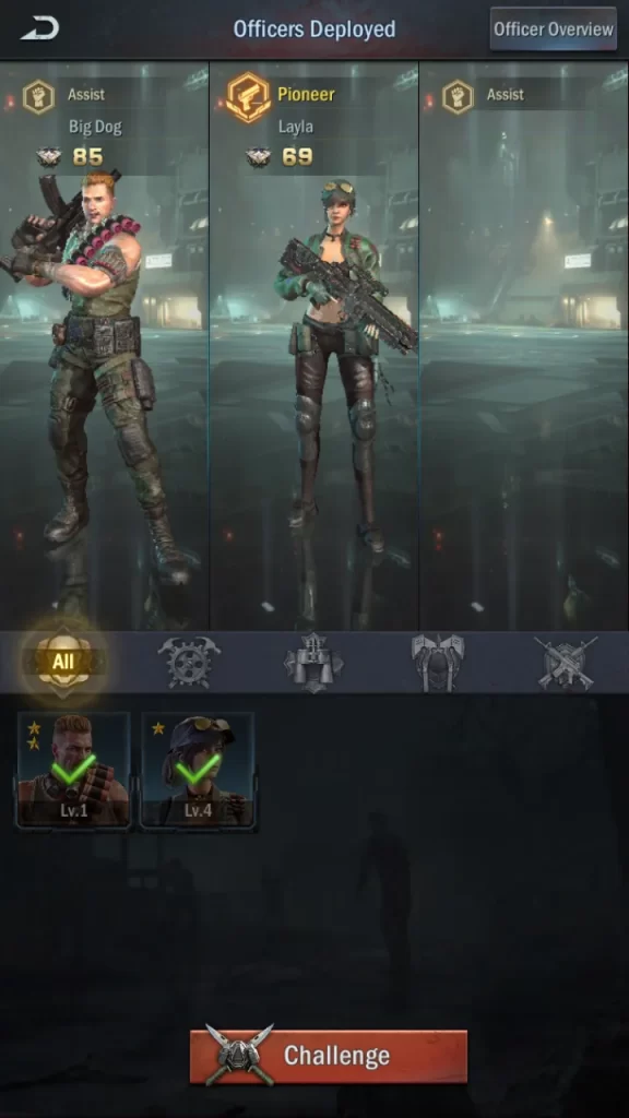 Only Layla, Big Dog, and purple rarity Warfare heroes are usable in this mode. Thankfully, you get both Layla and Big Dog for free. To preview the heroes playable in Mercenary Survivors mode, tap on the “Officer” button while in the game mode lobby. You can also see their skills here; rarer heroes tend to have more skills.