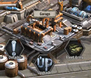 - The Garage is where your units hang around. You can see your army composition here as well as save unit setups for quick fleet deployment. The higher your Garage level, the bigger the fleets you can deploy.