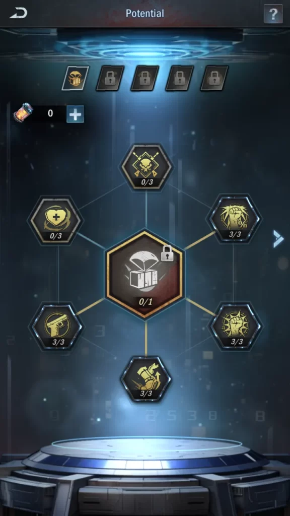 Each page of the potential screen contains several passives that you can invest in with canisters that you get from clearing Mercenary Survivor stages or through the Doomsday Recovery Plan. Nodes can be leveled multiple times, and each page has a big central node that requires you to level up all other nodes around it to the maximum level. Central nodes often contain game-changing upgrades, such as new features, so be sure to invest in your potential whenever you can!