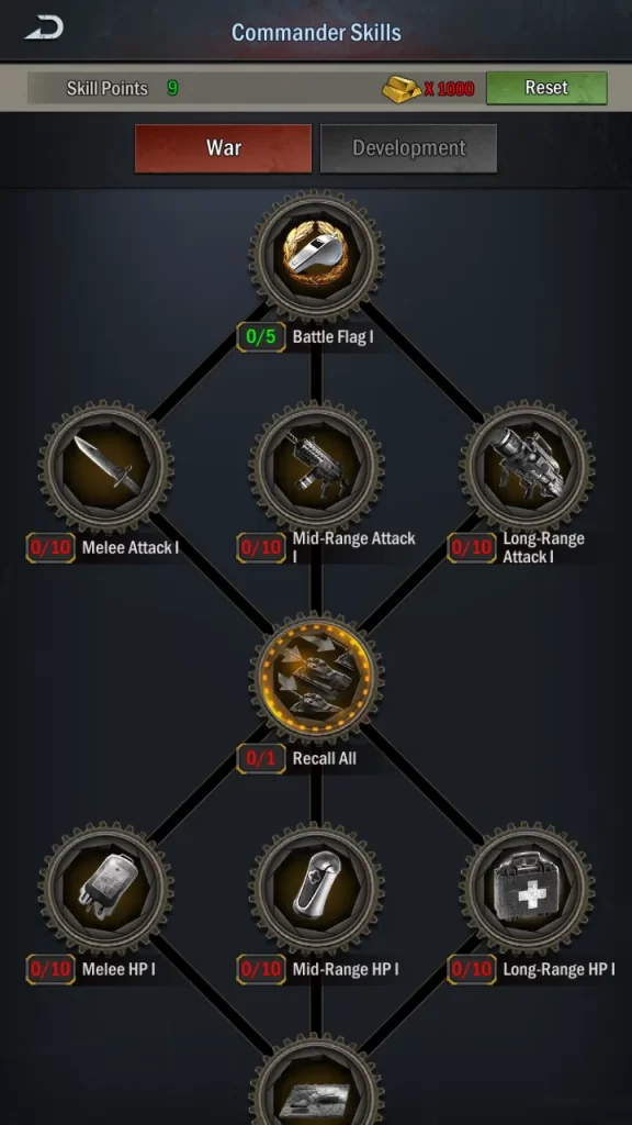 Lastly, you, as the supreme commander of your city, have your very own skill tree. To access your personal skills, tap on your portrait on the upper left, then tap Commander Skill. That will bring up this panel: