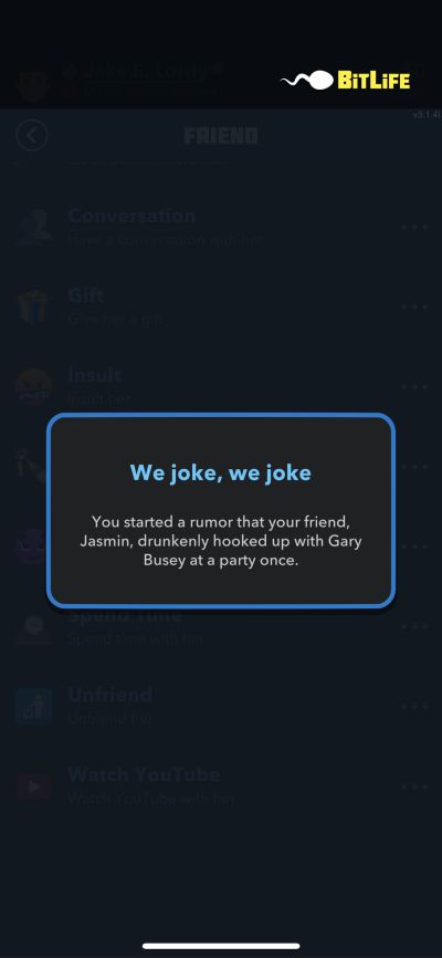 Probably the only tricky part of the Euphoria Challenge is the part where you have to assault your best friend. Experienced BitLife players know that there is no option to physically attack, or brawl with friends — the option is available with siblings, but not friends, so the most you can do to annoy your friends is to spread rumors about them, prank them, or insult them, and you won’t be able to fight back if they attack you.
