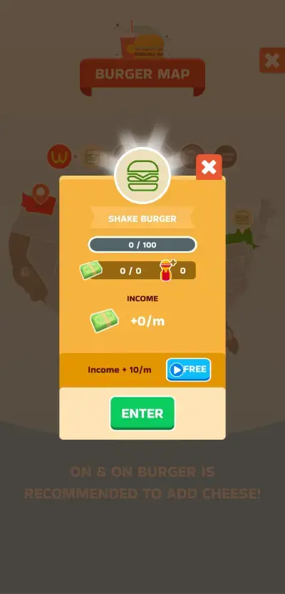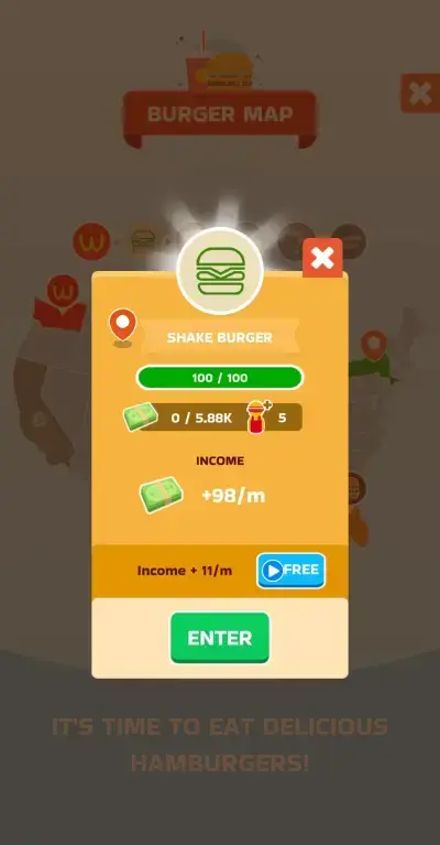 If you happen to put up more than one burger joint in your journey, a different ad offer will be available for each branch. Additionally, on the map screen, you can also take advantage of an ad boost that permanently increases the idle earnings for a specific burger joint. Just like the upgrades for the manager and the staff, we recommend taking advantage of this and doing it sooner than later.
