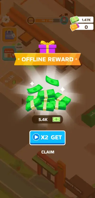 One of the best ad offers in Burger Please! presents itself to you after you log back into the game following a long break. A huge lump of cash will always be waiting for you as a result of your idle earnings and while you can claim it outright, playing a short video ad at this point will double those earnings. Naturally, this is an ad offer that you should not pass up on especially if you have been away from your virtual burger shop for several hours or so.