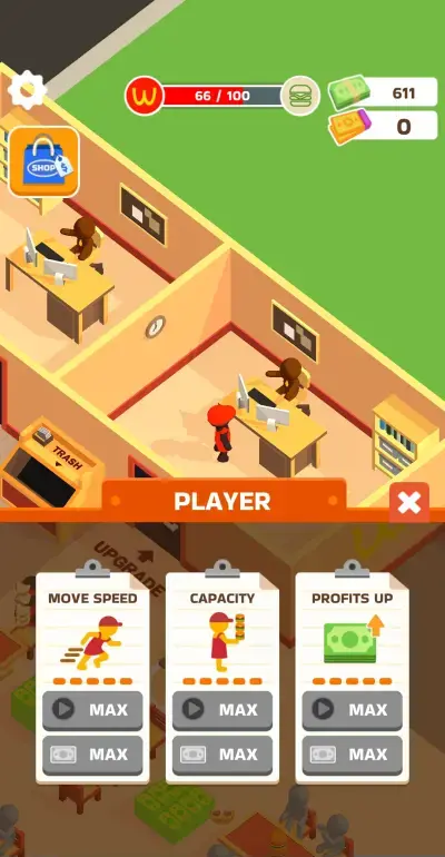 For the player, the available upgrades can boost profits, capacity, and move speed. For the staff, there is an equivalent upgrade option for capacity and move speed but employing additional staff comes in place of profit increase. Although the outright boost to profits seems like the top pick, its equivalent on the other side of the upgrade set, which is hiring additional staff, is also very important.