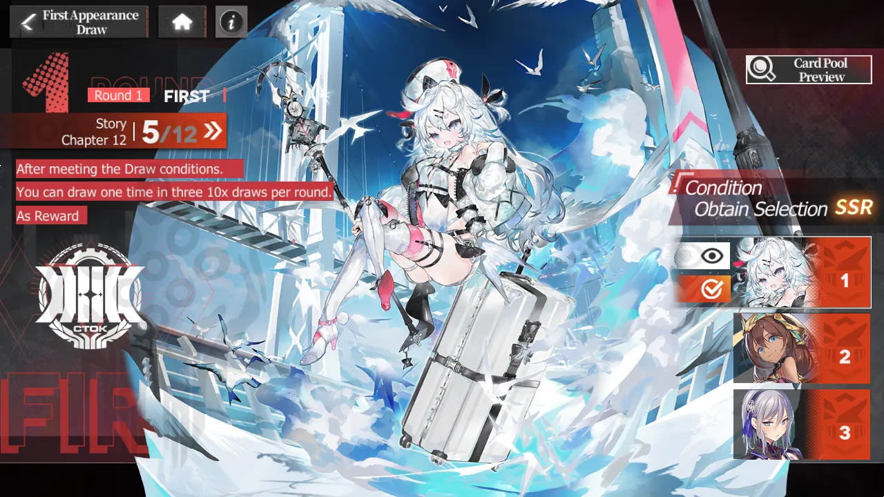 - New players get the First Appearance Draw which gives you 3 pulls of 10, each with a guaranteed SSR character. You can pick one of those pulls to get, but you’ll need to complete a series of missions to add those characters to your account. Use this to patch up holes in your team or find a powerful damage dealer or support if you’re lacking those.