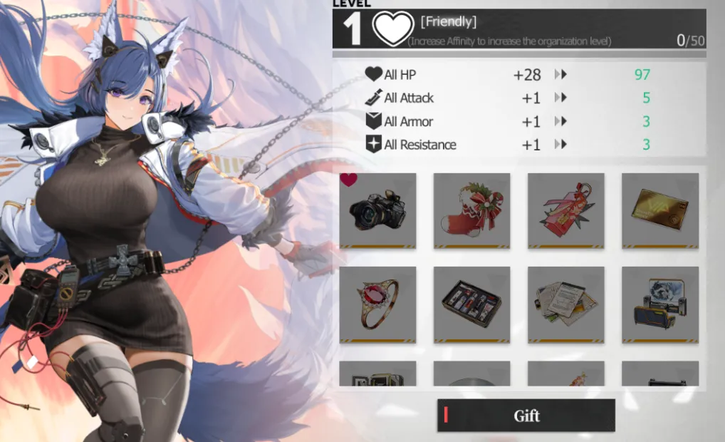 - Affinity can be raised by giving a character gifts. Higher affinity levels yield bonus stats. It’s not much, but it’s an extra way to squeeze more performance out of certain characters, such as your favorites.