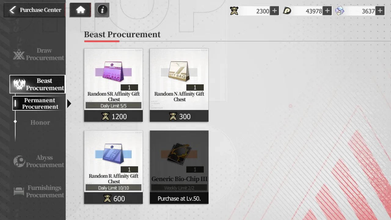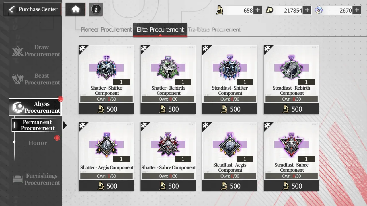 Finally, clearing abyss stages also nets you Abyss Points, which can be exchanged in the Purchase Center on the main menu for white tier (read: crap) gear, components for blue or purple gear, or modification experience. Note that these recipes aren’t unlocked by default. The deeper you’ve managed to go, the more exchange recipes become available!