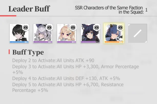 - Leader Buffs are triggered when you have at least 2 SSR Cases from the same faction in your squad. These buffs apply to all units, not just Cases from that faction.