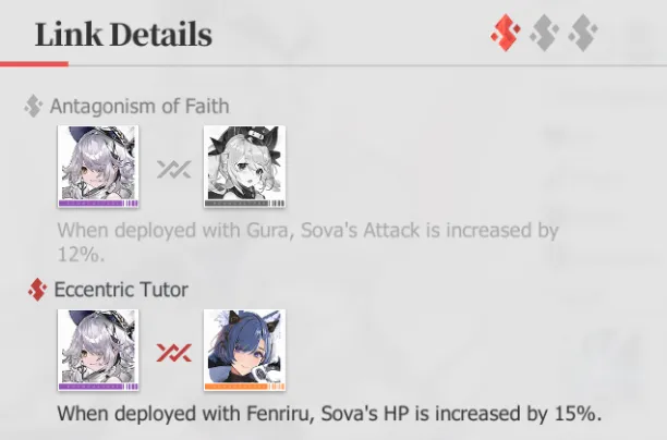 Link bonuses are activated when Cases that share a link are on the same team. The image above shows two of Sova’s three links – in this case, because Fenriru is on the same team, the Eccentric Tutor link is active, further boosting Sova’s HP. However, note that links are one-way. Just because Sova has a link with Fenriru doesn’t mean that Fenriru has one with Sova.