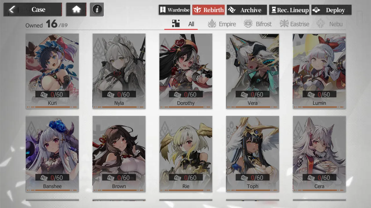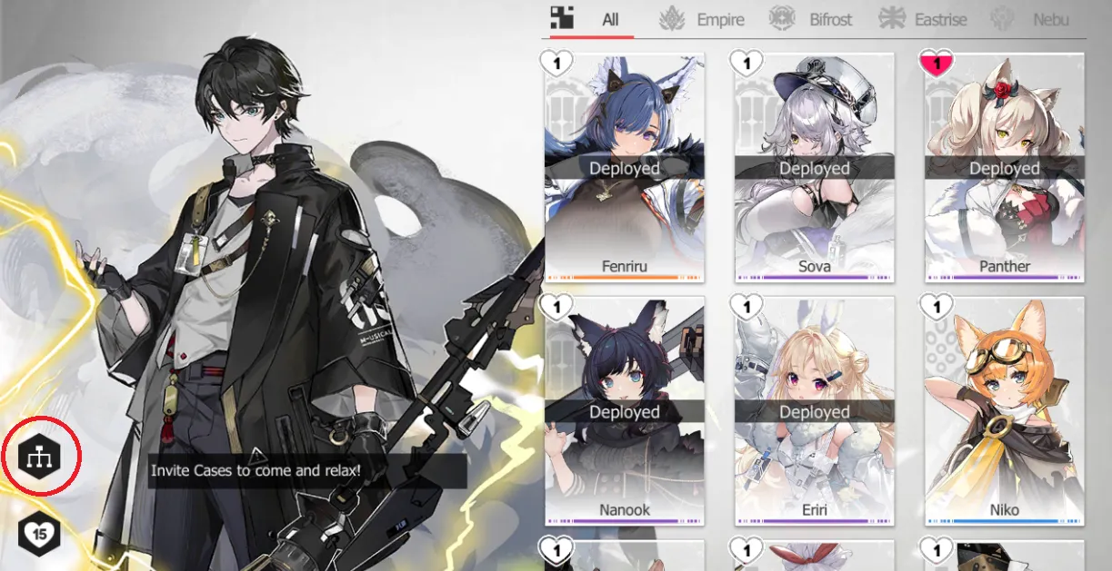These four factions are Empire, Bifrost, Eastrise, and Nebu. When you view a Case in their character sheet, their faction’s emblem will be displayed behind them. Note that there is no text that indicates which faction a case belongs to, meaning you’ll need to memorize each of the four emblems.