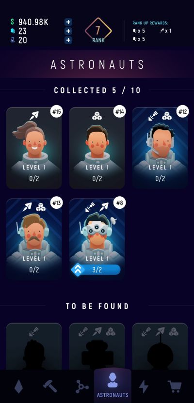 In the shop, which you can access via the cart icon at the bottom right side of the screen, random astronauts will be available to recruit using relics. Since astronauts have different rarity grades, you can expect that their costs will differ depending on their grade. Common astronauts cost 5 relics; rare astronauts cost 20 relics; epic astronauts cost 50 relics; and legendary ones cost 100 relics.