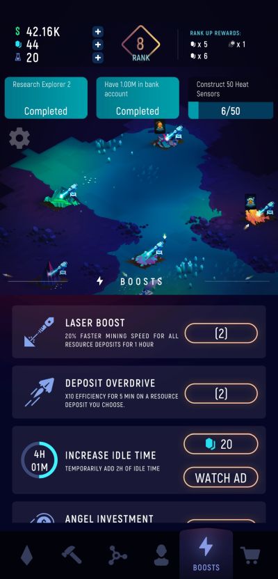 A core concept that prevails across every idle game like ExoMiner: Idle Miner Universe is that you can continue to earn resources even if you are offline and away from the game. Considering that upgrades on deposits increase output and directly lead to more earnings, what you should always consider is to invest back the cash you earn to upgrade them and reap even more profits.