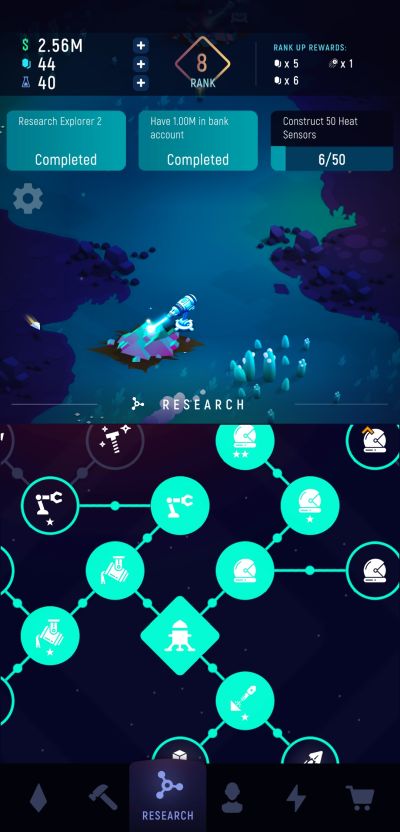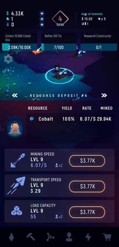 In addition to introducing you to the rest of the mechanics in ExoMiner: Idle Miner Universe, each level you complete also earns you valuable rewards. Levels are not just numerical indicators of progression as well and can serve as keys towards unlocking some research nodes. Be sure to remember ranking up by clicking on the level number after accomplishing all 3 objectives.