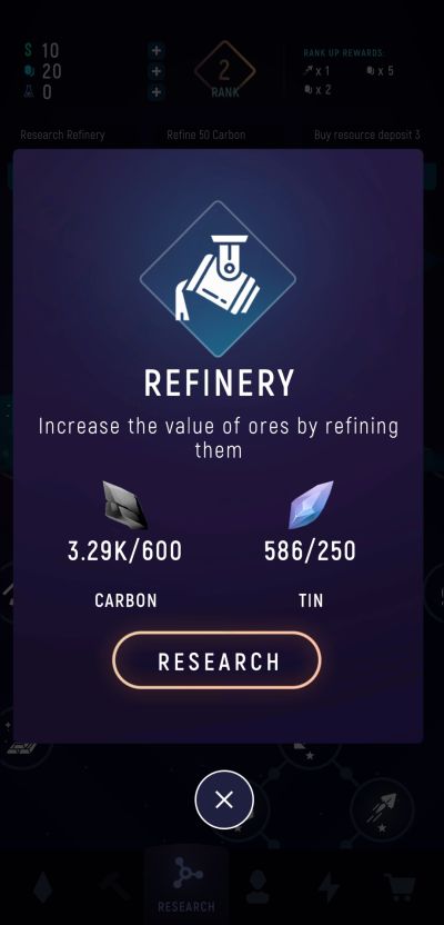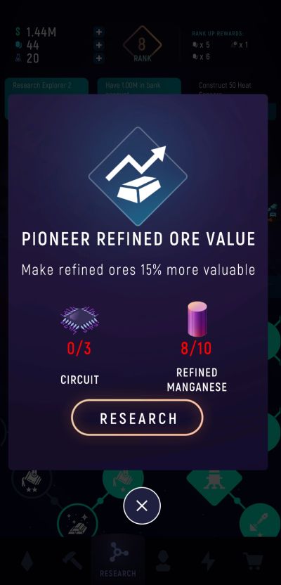 Refined ores as well as every other product you can create through them are not exclusively used for profits. These items are also important for expanding your mining business and are used as ingredients for research. You can access the research feature via the node icon at the bottom of your screen. It may appear as a confusing web of nodes early on but you will quickly get used to it after some time.
