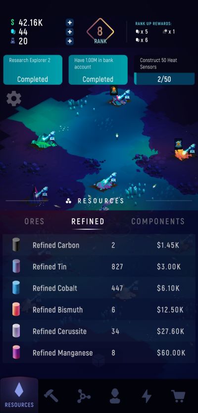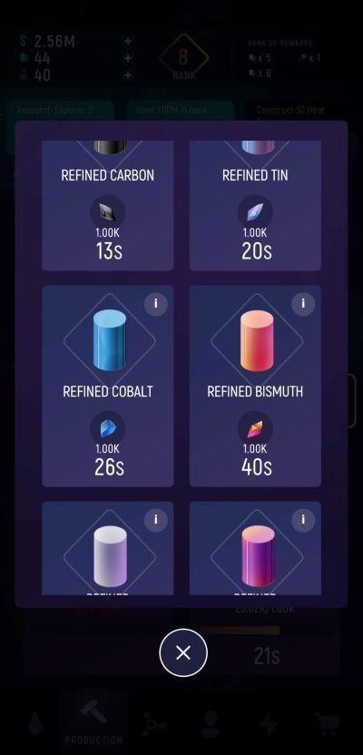 Refining each ore also comes with a price tag so in order to refine rarer minerals, you need to be ready with enough cash as well. The same goes for construction. Each new item you can produce will have a one-time cost to unlock them. Note that unlocking new refined items and products count as investment options as well so you can expect that money spent on each of them will have their respective contributions to increasing your profits in the long run.