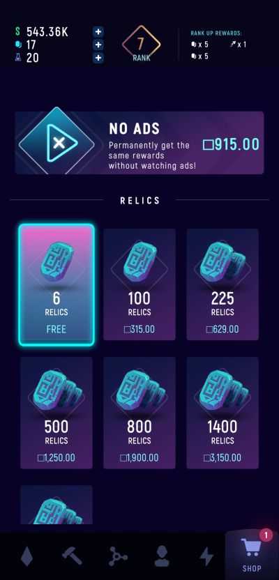 You can also earn random amounts of relics from the shop from time to time. You actually do not need to play a video ad to claim these freebies. Each time you see an indicator atop the cart icon, click on it and claim your free relics. Relative to the shop, check the available astronauts as well as good offers may present themselves randomly.