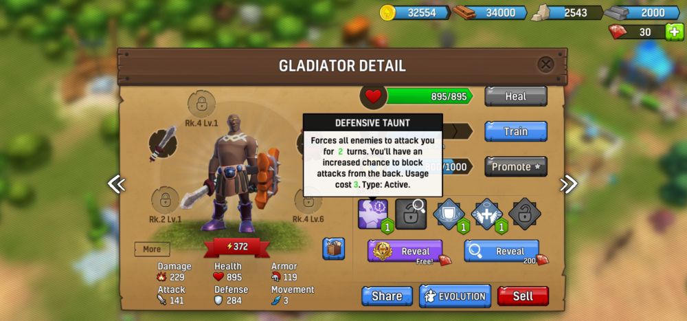 Revealing a Gladiator’s skills costs a whopping 200 gems. This allows you to see the Gladiator’s future skills, to see whether they’re worth keeping… but it doesn’t unlock those skills. Gems are typically used to get gold and premium statues, which are in turn saved until you unlock new Gladiator classes by upgrading your city and HQ.