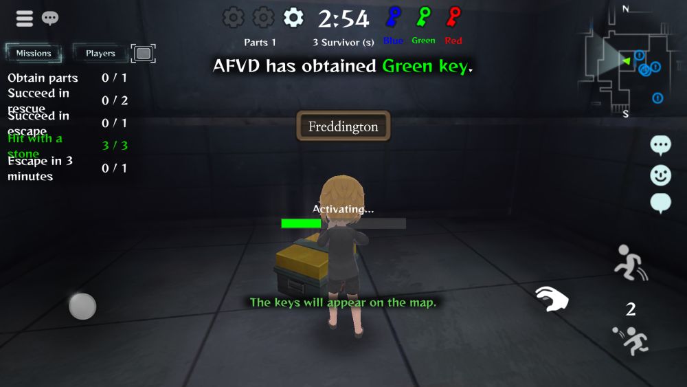 The first PvP game mode is Escape, where Survivors are given five minutes to escape the map while the Pursuers try to capture all the Survivors before they do so. Survivors start with three stones, and must find three parts in order to unlock the exit door. The parts are stored in chests locked behind certain colored doors, and the doors themselves have three corresponding keys in red, blue, and green.