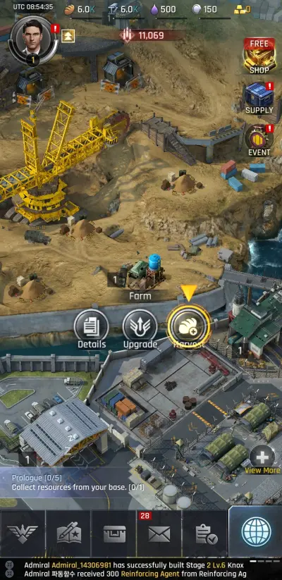 Your first order of business will be collecting resources. There are four resources for you to manage and gather: Food, Steel, Oil, and Silver. The farms and mines of your base are located near the mining machine at the upper left corner of your base.