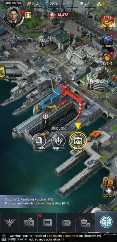 - Shipyard: Whereas aircraft require two buildings to build and store new Jets, the Shipyard handles both construction and storage, with assigned ships selectable from the docks nearby. While the Shipyard still uses blueprints to build new ships, leveling them up requires Ship XP, acquired from attacking Armada fleets and bases. Just like the hangar, you can only have so many ships assigned to combat duty until you upgrade your shipyard, and a newly-built ship must be claimed before a new one can be commissioned.