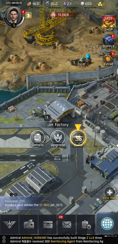 Your advisor Olivia recommends that you start building up your forces to fend off any attacks from the Armada or other Admirals. While all new accounts start with a peace shield to deter attacks from other Admirals, it will not last forever. The first thing the game recommends you build is a jet, namely the F18 Hornet.