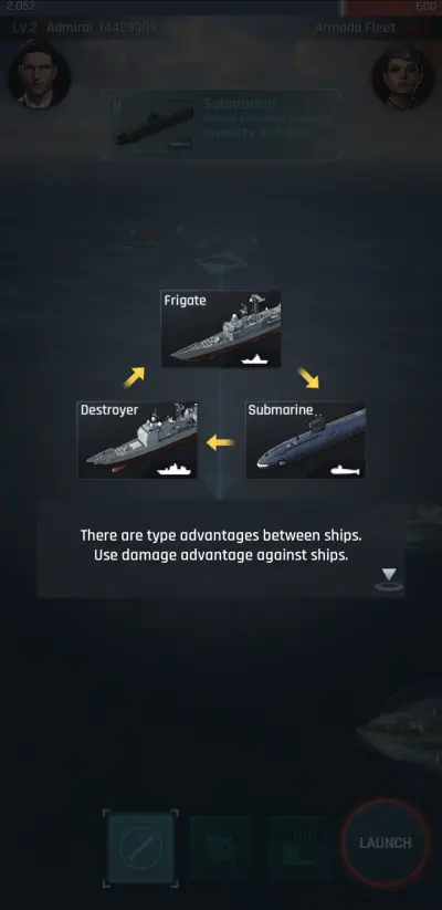 There are three types of ships you can build: Frigates, Destroyers, and Submarines. The ships interact in a rock-paper-scissors fashion, with Frigates beating Submarines, Submarines beating Destroyers, and Destroyers beating Frigates. Instead of collecting blueprints from Armada fleets, new ship models are unlocked by researching them at the Research Labs, with Olivia’s guidance unlocking the Knox-class Frigate for construction and use.