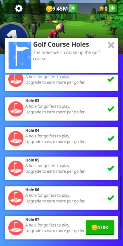 Idle Golf Club Manager Tycoon does not just reward active tycoons as your virtual golf course will continue to earn profits even if you are offline and away from the game. This is actually one of those opportunities we discussed earlier for you to earn a huge sum of cash, which leads to an opportunity for you to finally be able to afford unlocking the next hole in your expanding enterprise.
