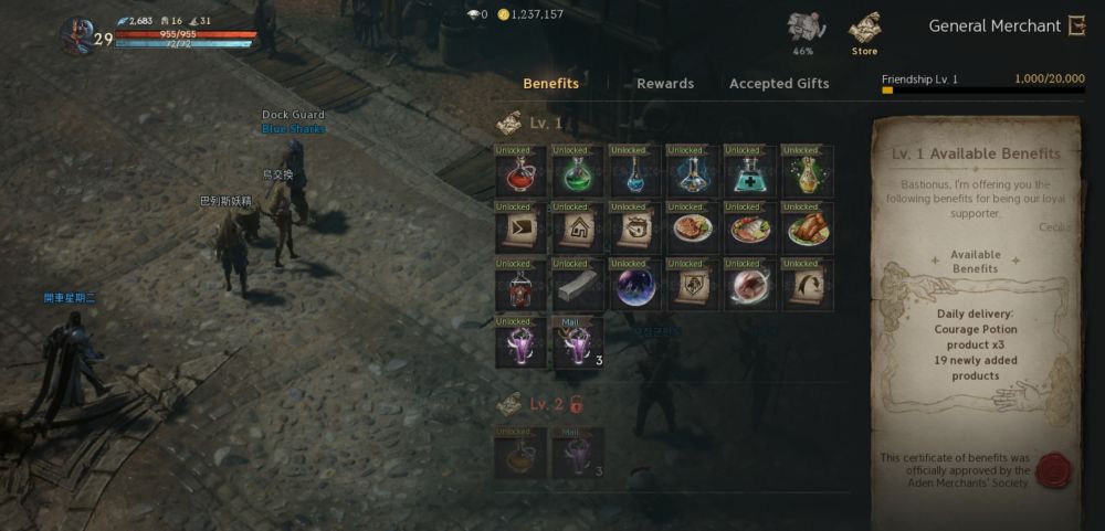 Upon reaching a new level or stage of friendship with a merchant, you can unlock a one-time milestone reward, which is comprised of items. More importantly, there are permanent effects that come in the form of additional items available for sale, daily items received from them, or even discounts on purchases from the specific merchant types. Given that you will always need to interact with these merchants from early game all the way till the end game, it is recommended to work on unlocking the additional benefits you can earn from all NPCs in Lineage W.
