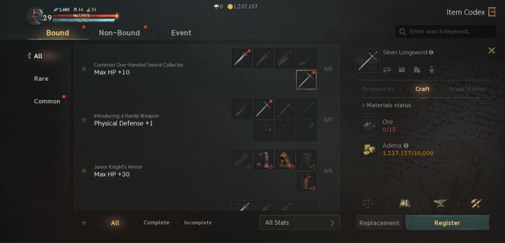 While item management in conventional MMORPGs are generally limited to ensuring ample space in your bag as well as storage, if provided, Lineage W provides an added measure that creates a more fulfilling outcome for having extra copies of items and resources. The Codex System in Lineage W serves like a system for documenting items you have collected as well as provides information on them as well as each of the monsters you have encountered. There are 4 separate codices in Lineage W and each one should be peeked into regularly.