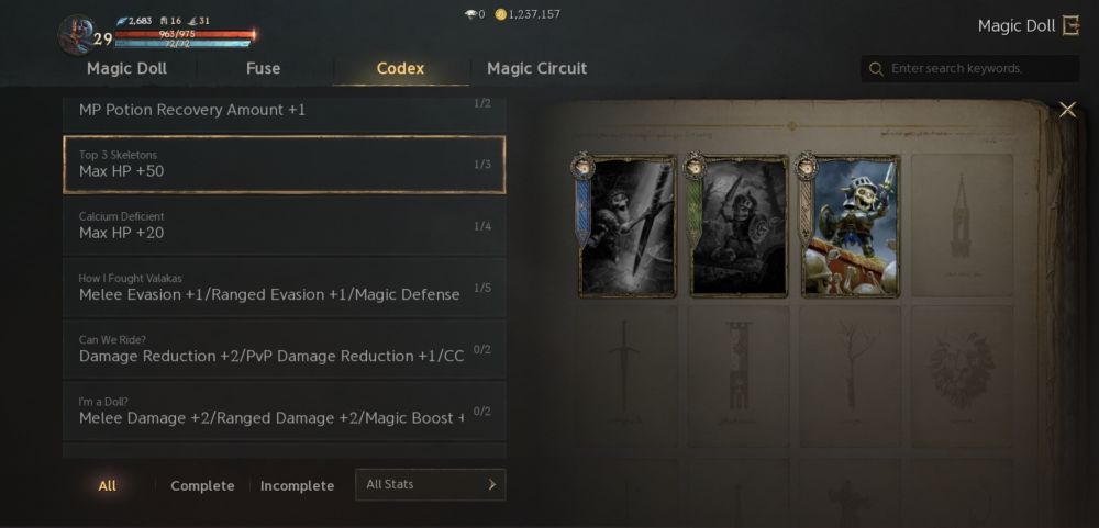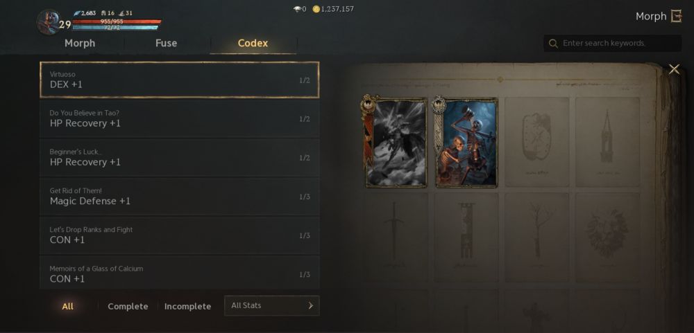 The Codices within both the Morph and Magic Doll features work the same way. Although extra copies of morph cards and magic dolls are collected as fusion materials, remember to register some in their respective codices to be on your way to earning permanent perks. Considering all codices, it is important to keep in mind as well that your overall progression in it will permanently boost your stats. It does not apply exclusively to your first or main character, but also extends to other characters you will use in the account.