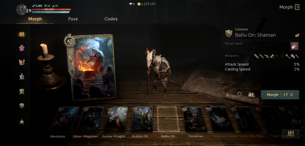 You can acquire morph cards from the store or the blood pledge merchant and you can obtain them as rewards from some quests or completely analyzing specific monsters in the monster codex. You can also obtain duplicate morph cards for a chance to acquire a higher tier one through the “Fuse” tab in the Morph window.