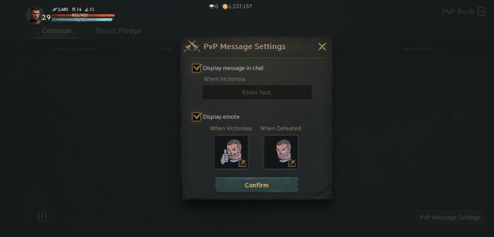 This can lead to various actions from members of your Blood Pledge against the Blood Pledge of the attacker. Last, but not the least, you can also customize PvP message settings through its button on the lower right side of the page. You can create a message that gets posted in chat when you are victorious and display emotes real-time for both victory and loss.