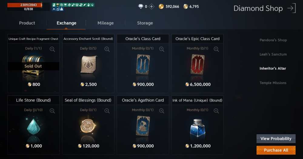 The Inheritor’s Altar section of the cash shop is another place you can spend your hard-earned Oracle Tokens. If you’re not buying skillbooks from Einhasad’s Priestesses, you can trade in your tokens here for Unique Craft Recipe Fragment Chests, Accessory Enchant Scrolls, Life Stones for reforging, and most prominently, Class and Agathion Cards. I highly recommend buying at least the recipe fragment chest each day, as you’ll be needing quite a bit of those if you want to craft blue gear. The cards, on the other hand, cost a doozy at a whopping 900,000 for the blue rarity and 6.5 million for the red card. These can only be bought once a month, so if you’ve got enough tokens, don’t forget to make the exchange!
