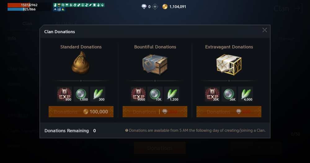 If you haven’t joined a good clan yet, do so. Not only do you get Medals of Honor and Einhasad’s Blessings, but each donation increases the clan’s exp. You can donate 5 times a day, and you can donate 100,000 Adena per donation. If you want to help your clan grow even faster, you can donate diamonds too in bundles of either 300 or 900.