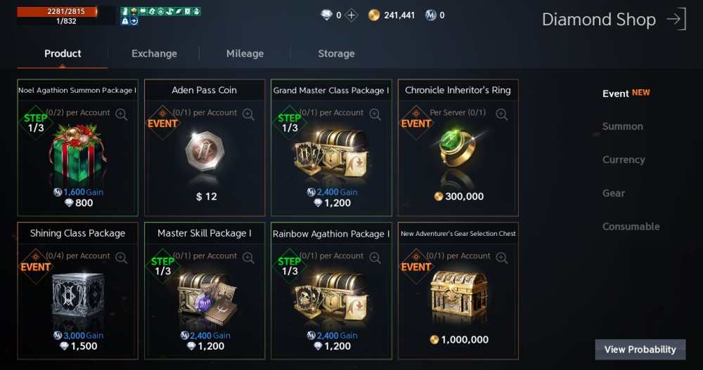 Since you’re already at the cash shop, be sure to check out the Event tab, under the Product section. Most of the items there can be purchased with real money, but sometimes you can trade Adena for some sweet loot.