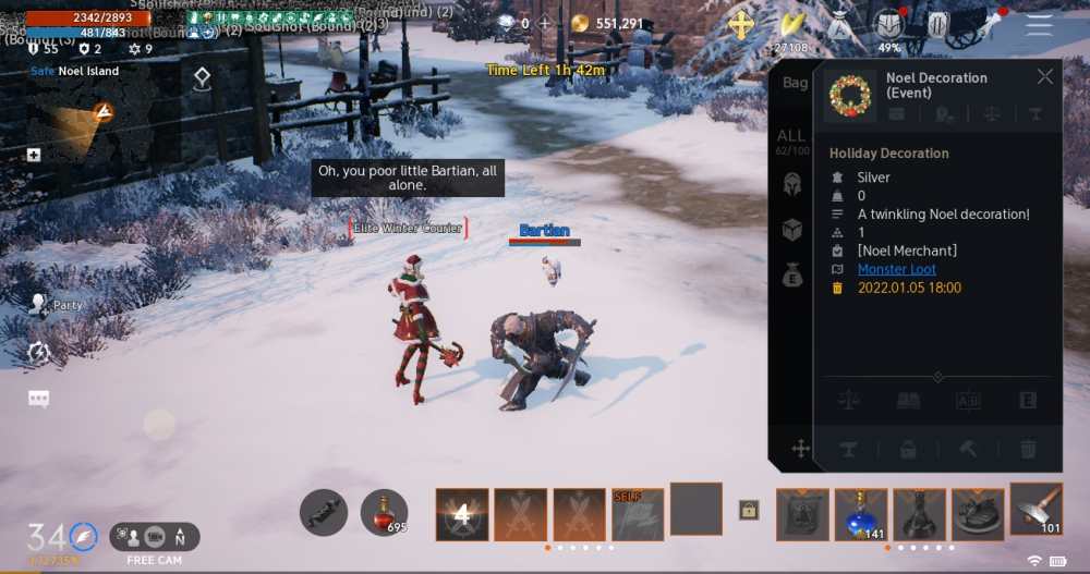 Monsters on Noel Island drop Soulshots like crazy, and you might find yourself frustrated that your character decides picking them up is a better option than fighting. Tweak your loot settings via the Settings menu, then go to Combat, Claim, and turn off “Loot items dropped by other players while Hunting”. Noel Island monsters also drop Noel Decorations that can be traded with Noel Merchants in town. The event shop vanishes on January 4, so you have a lot of time to grab these wreaths.