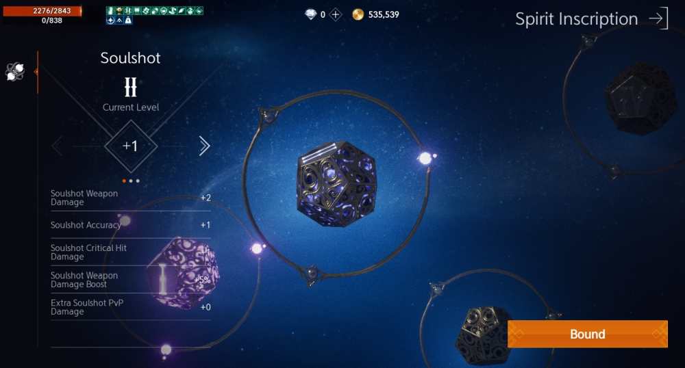 You can upgrade your Soulshots to get more out of them. Soulshots can be powered up to have increased damage, accuracy, and critical hit damage. This isn’t a one time thing too; any upgrades you buy apply to all your Soulshots. In essence, it’s like investing in a passive skill that improves Soulshot performance.