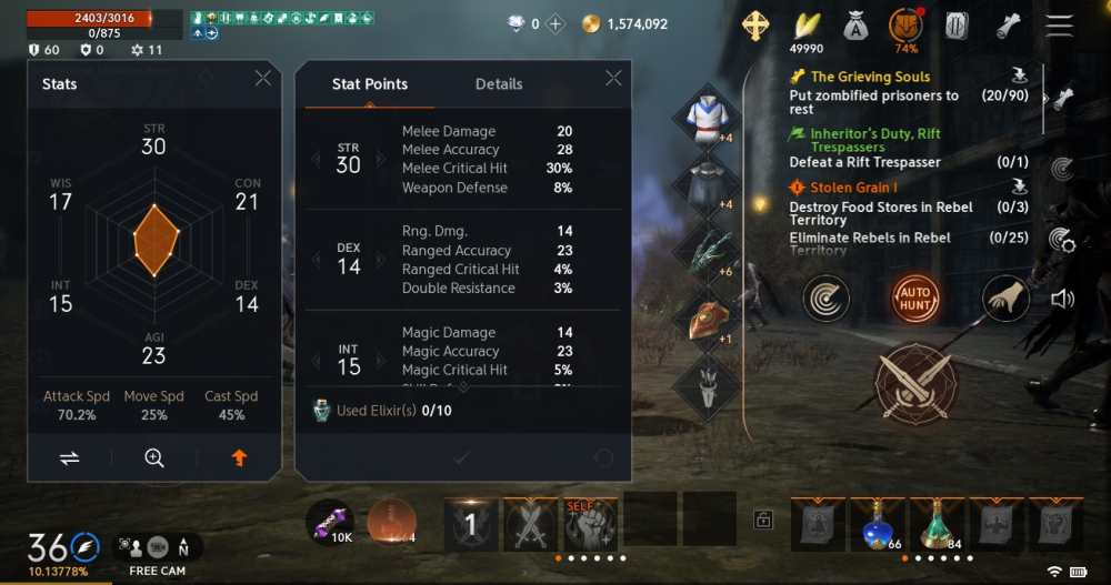 While we’re on the topic, you can tweak the autocombat settings via the Quick Settings menu. The most important setting I found here is Targeting Range. You can set it to as low as possible (20 meters) so that your character doesn’t wander too far off from where you first hit autohunt. This way, you can focus your grinding in smaller areas, making it easier to target specific mobs.