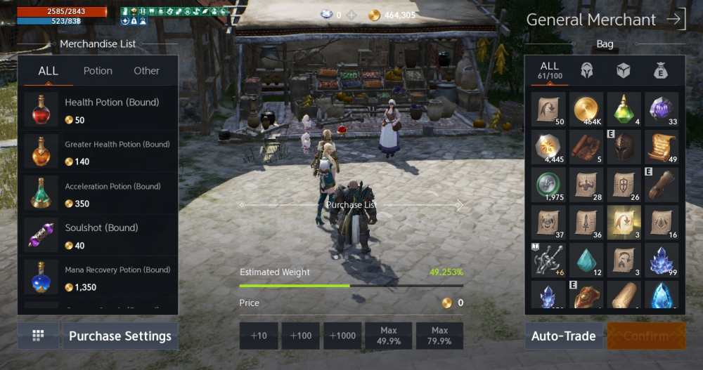 At that point, you’ll be unable to attack or use skills. Fortunately, shops have a feature to help you avoid going over the limit. When buying an item, you can not only tap the +1, +100, or +1000 buttons to buy more of an item, but you can also choose Max 49.9% or Max 79.9% to buy items until you reach that carry weight.