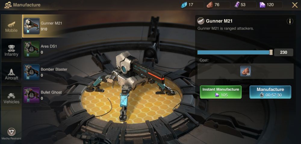 • Mecha Factory: This building is crucial to your success as an army because this is where you will be producing Mecha warriors. Mecha units make up the bulk of your force in battle. Manufacturing capacity will increase as the building’s level goes up. You may compliment your Mecha Factory with the Mecha Camp, but this is optional.