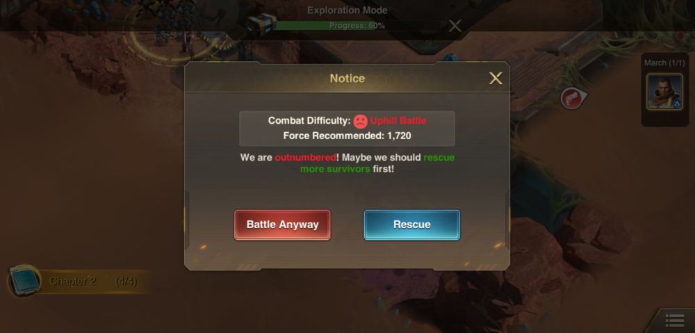 Fortunately, the game will warn you if the combat difficulty is too much for your troops to handle. In this case, heed the warning and scout for more survivors in the area. When you’ve managed to increase the number of your troops, only then would it be wise to engage in battle.