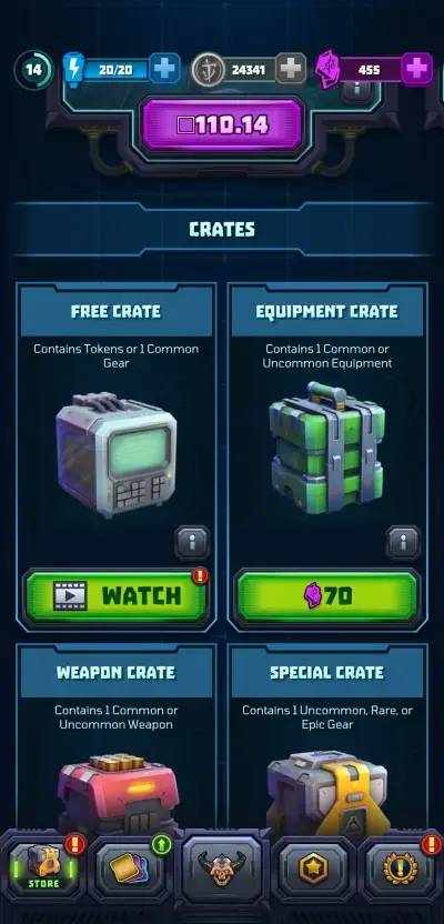 Within the in-game shop, you should consider claiming the free crate and free coins. All it takes to do so is to play a 15 to 30-second video ad for each one. The crate can net you a common gear and although these gears are at the bottom of the rarity list, you will come to appreciate getting one daily given the difficulty of doing so anywhere else. 2,200 free coins are well worth a 30-second ad as well.
