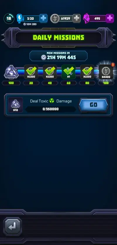 Every objective you accomplish earns you points and points accumulated earn you rewards at the top of the page. Though most of the rewards are coins, an important one you should always aim to get is the equipment key as every chance to obtain new gear should be pursued. In any case, you can never really have more than enough coins in Mighty DOOM as well so be sure to earn all daily mission rewards as much as you can.
