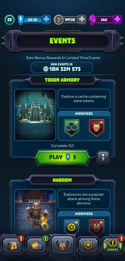 Each day of the week, Mighty DOOM provides players with a special event to break the monotony of the usual campaign runs. After all, the number of repeat runs needed for you to just make it through all 40 stages of the first level will already be a very challenging endeavor. Special Events can also be quite challenging in that while they can help you earn specific rewards, some modifiers give gameplay a unique twist.