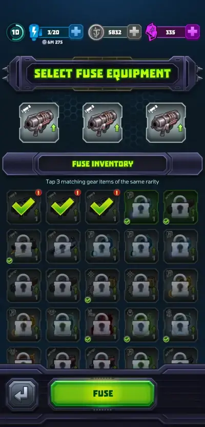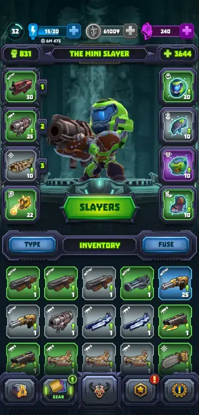 Mighty DOOM provides a means of obtaining higher-grade weapons and armor items and this is done through the fusion feature. In your inventory that can be accessed through the gear icon at the bottom of the screen, there is a “fuse” button just to the right of the inventory above your gear. This will have an indicator whenever you have items that can be fused. Fusion requires 3 copies of the same gear and you will also need to spend some coins to fuse items.