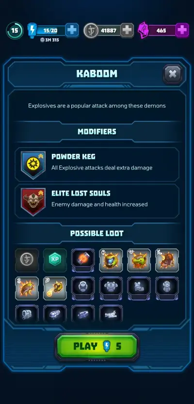 As far as loot goes, Mighty DOOM provides you with a lot of upgrade materials at the end of each run, depending on how far through the world you have reached. You can also earn coins, gears, Slayer shards, and keys that unlock crates from the shop, with the latter 3 being rare finds. More importantly, every run you earns you EXP for your account level, and this is very important as this caps how far you can upgrade your marine and how many mastery rolls you can purchase.